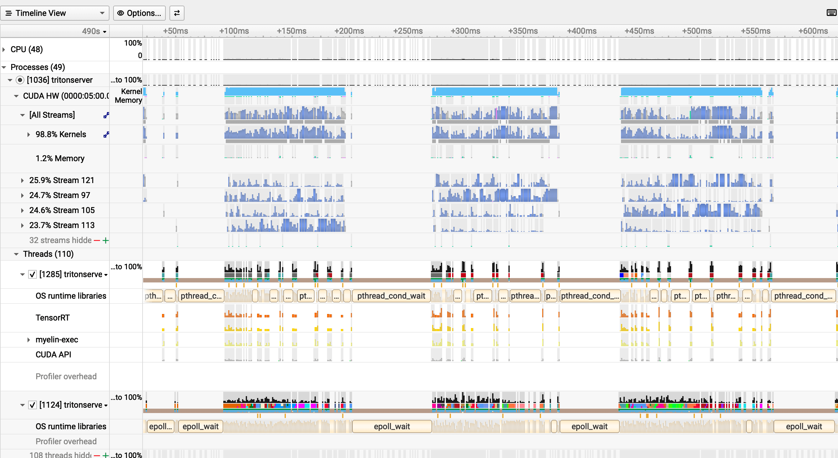The osrt_sum report captures host-side threading. Three syscalls are worth knowing: futex is the Linux kernel's fast mutex — every lock and thread wake/sleep in Triton goes through it, so high futex time means heavy thread coordination overhead. sem_timedwait is Triton's internal scheduler waiting for work in the batching queue. sem_wait indicates a model instance is not yet available; high total time here means instance contention.