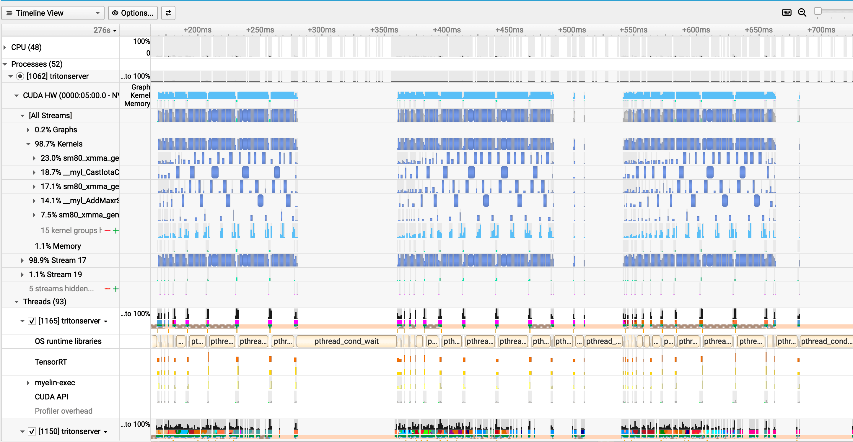 The stack and config knobs (dynamic_batching, default_queue_policy, optimization.cuda.graphs) are covered in Part 1. The short version: TensorRT compiles the model into a hardware-specific fused execution plan, and myelinGraphExecute in the profiler is the result of that — one kernel for the full forward pass rather than dozens of separate dispatches. cuda.graphs: true goes further and eliminates the per-kernel CPU launch overhead by replaying the entire dispatch sequence as a single call.