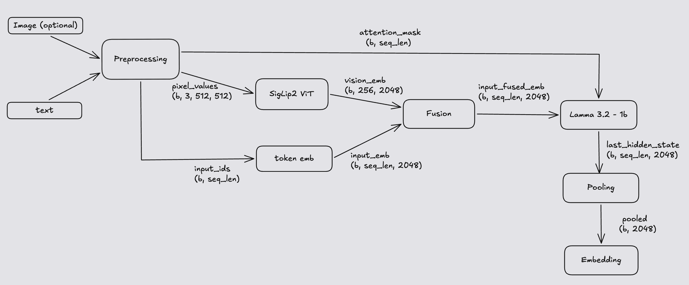 The pipeline has five stages: vision encoding, text embedding, fusion, the Llama transformer, and pooling. Here's how they connect: